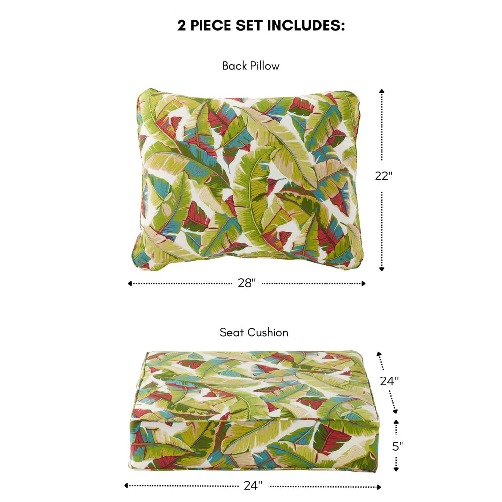 The plush comfort and coastal style meet together in this 2-piece set of outdoor cushions. Crafted with 100% polyester covers, this set features a square seat and back cushion detailed with piped trim. It comes with 5'' of dacron-wrapped foam filling, creating a comfy place to lounge, read, and relax. Each piece resists weather, water, UV rays, fading, and stains. Best of all, it comes with corner ties, so it's easy to secure your furniture.