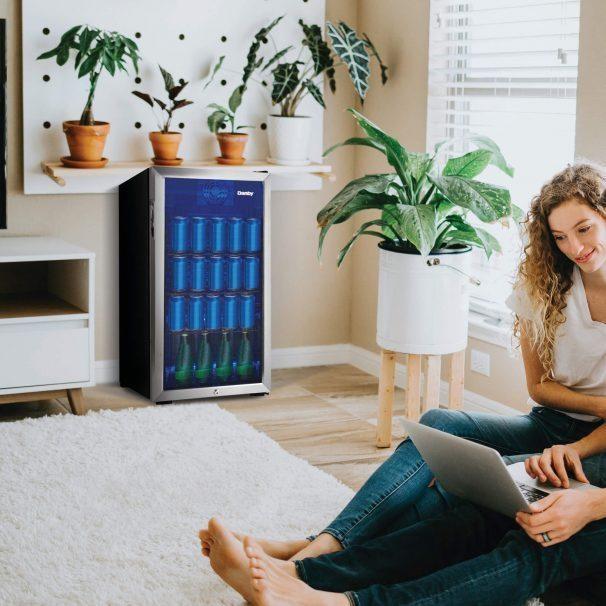 Danby freestanding beverage fridge is a 3.1 cu ft. mini fridge, designed to store beer, pop and a variety of other drinks. This unit is a convenient yet modern option for anyone looking to enhance their hosting space. Whether you're updating your wet-bar or adding extra drink storage to your basement, this Danby beverage cooler offers compact versatility with its adjustable wired shelves and blue LED lights. The smooth back design allows for flush installation near a wall, and the reversible door hinge allows you to adjust for either left or right-handed door opening. Additionally, this unit features an easy to use mechanical thermostat, with a temperature range of -2 to 10 C (35.6F 50F). With its sharp clean lines, this mini bar fridge is designed to blend with any decor style seamlessly.