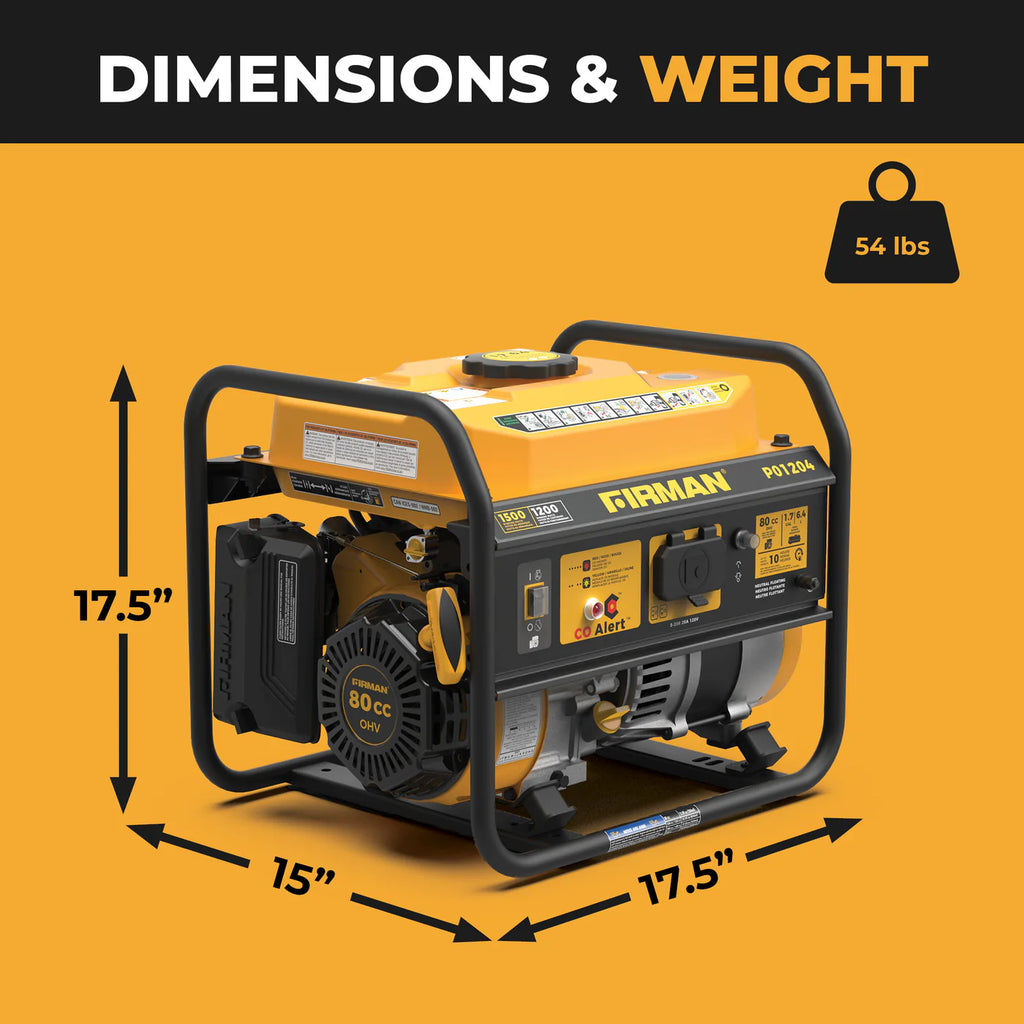 Open Frame Generator. Known for its lightweight design and ease of use, the FIRMAN P01204 gas portable generator offers 1200 running Watts and 1500 Starting Watts, making it the ideal companion for those on the go.