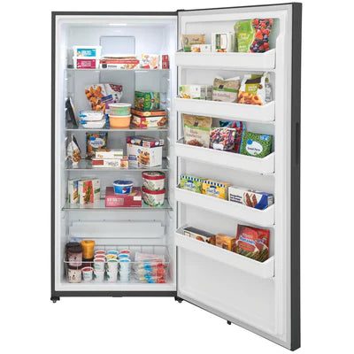 Frigidaire upright freezer features a reversible door, power outage assurance, flexible interior organization system a total capacity of 20 cu. ft. and is garage ready.