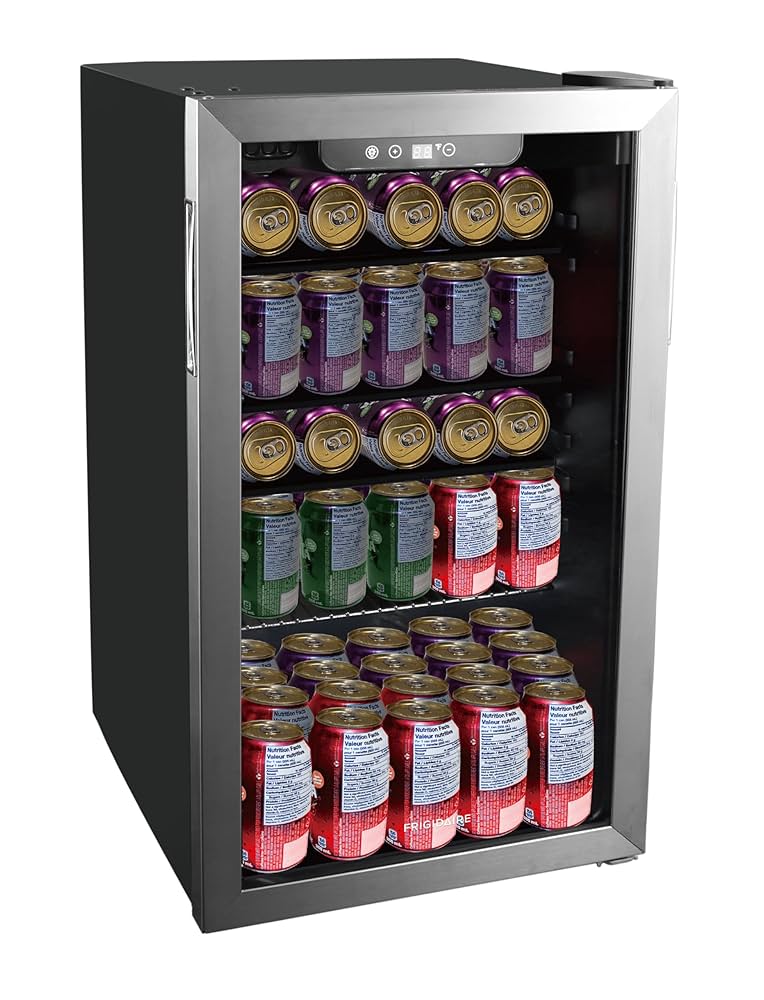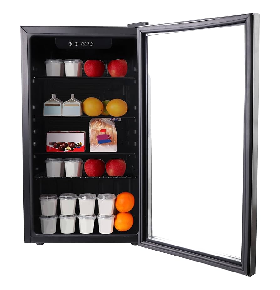 Keep your beverages perfectly chilled with this 3.4 cu. ft. freestanding cooler, capable of holding up to 115 cans or 34 bottles. Featuring a sleek, full stainless steel door and double pane glass, you can easily view your drinks at a glance. Three slide-out shelves provide easy access, while the adjustable electronic thermostat with a digital display ensures precise temperature control. Ideal for any setting, this cooler combines style with functionality.