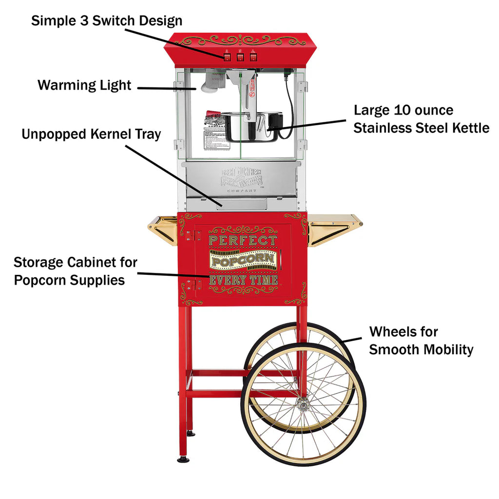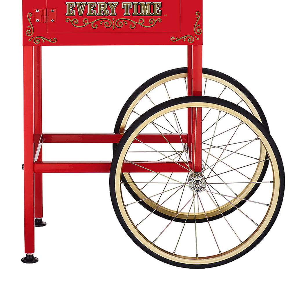 - The detachable popcorn machine cart features 17.5-inch bicycle-style wheels, a storage supply cabinet, and a large working shelf