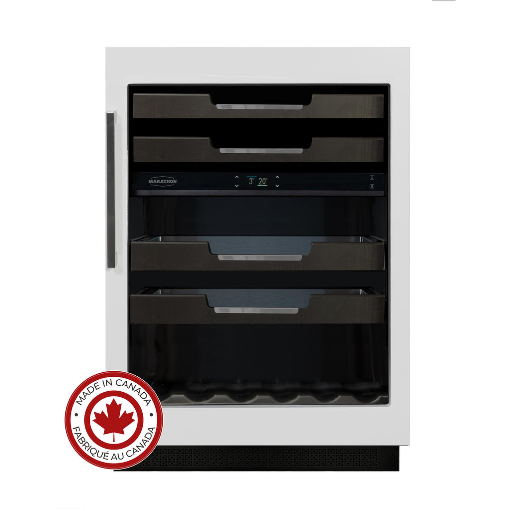 The True North Collection is a tribute of Canadian heritage, inspired by the natural beauty and strength of our landscape. Inspired by the vineyards of British Columbia’s Okanagan Valley, this Canadian-made wine & beverage cooler offers the best of both worlds. The dual zone configuration features two wine shelves in the upper zone and two glass beverage shelves in the lower zone, each crafted from Canadian maple hardwood dark-stained with a subtle stainless steel accent. With dedicated spaces for wine and beverages in one refined appliance, it combines versatility, performance, and timeless Canadian craftsmanship.