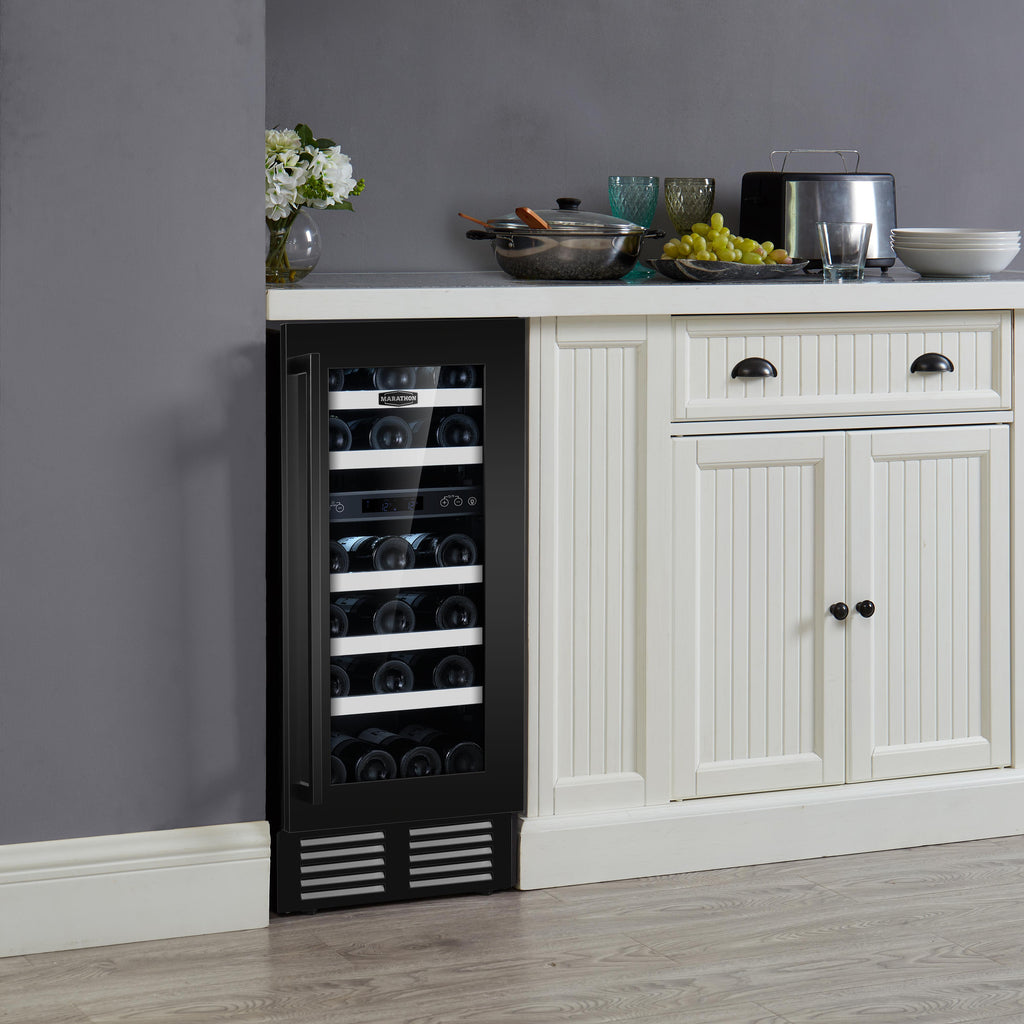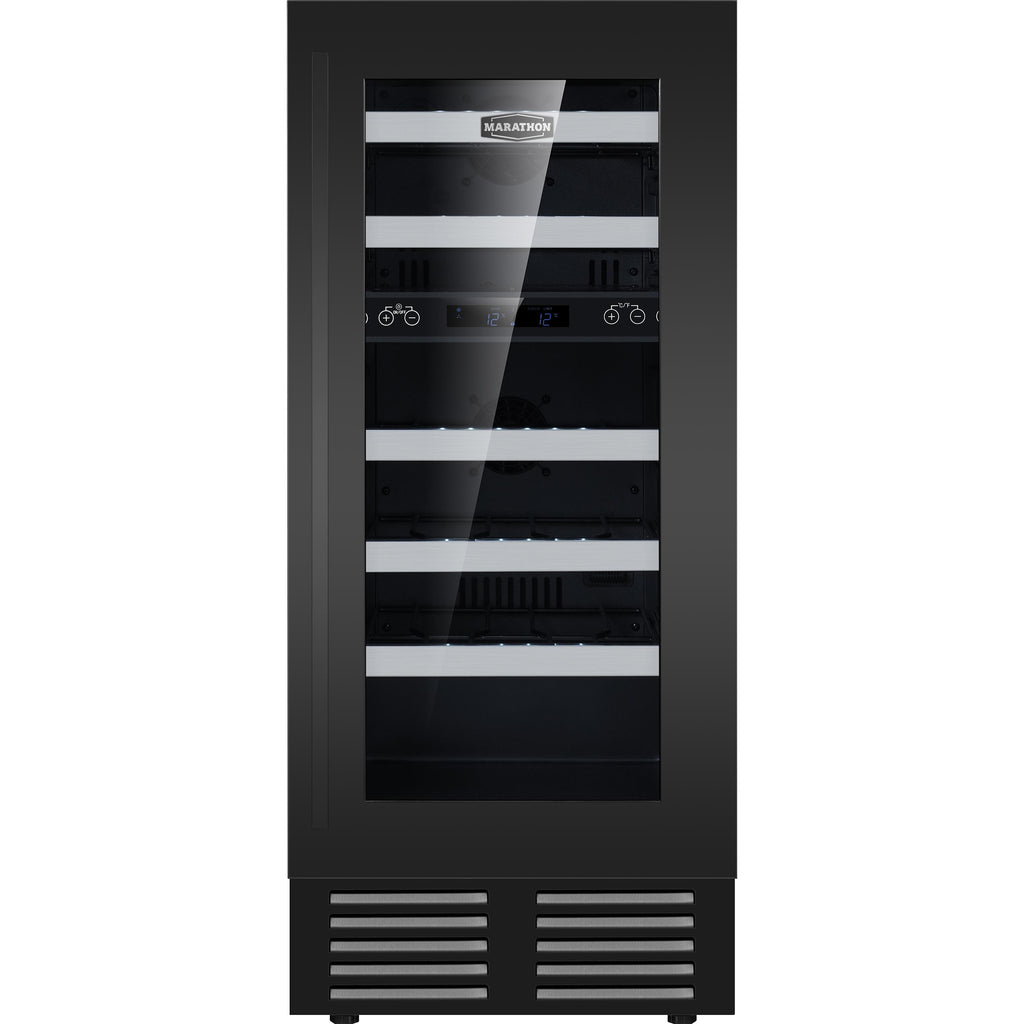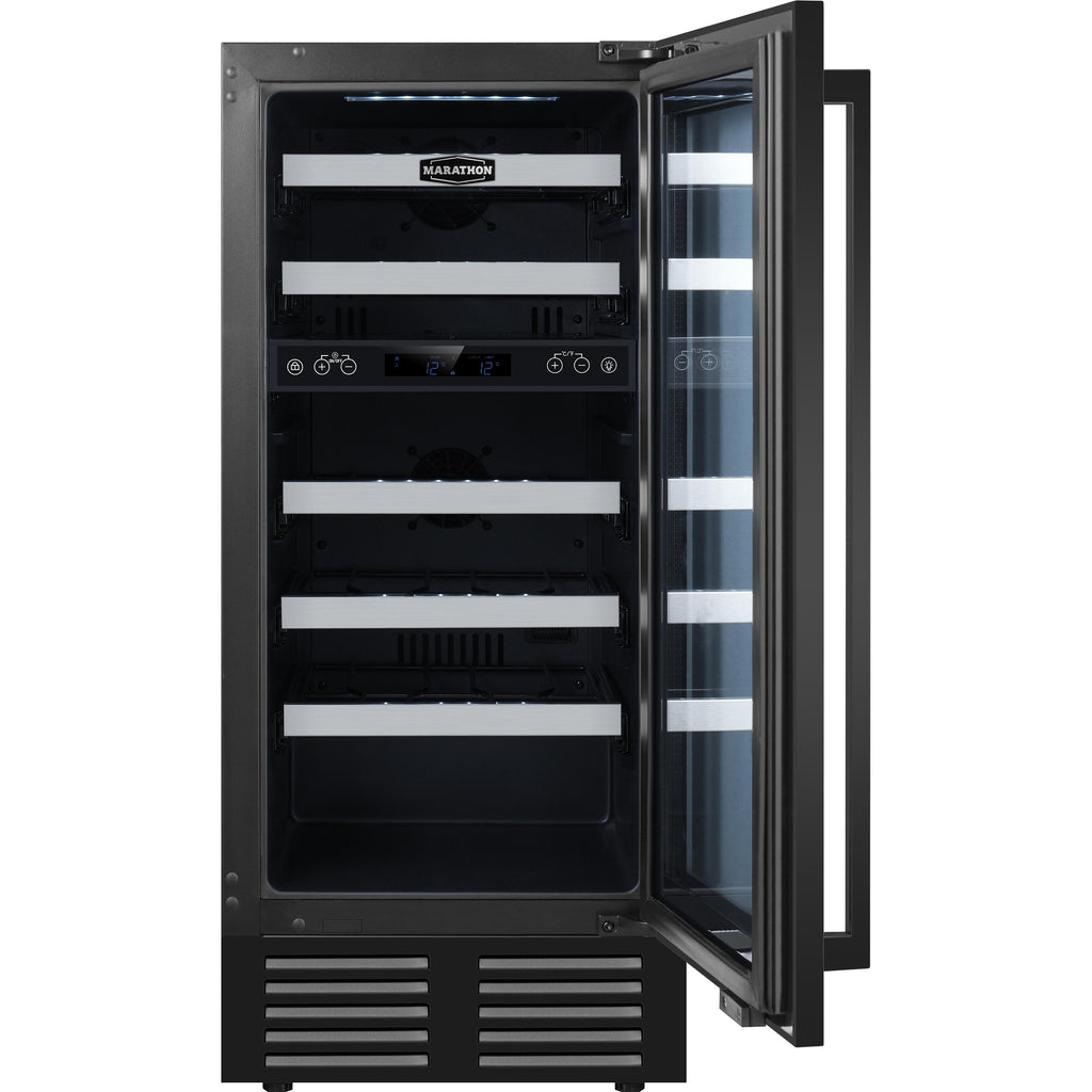 The Marathon 15” dual zone wine cooler offers a sleek luxurious design for those looking to maximize their space. With a 28-bottle capacity, there is ample room to store your favourite red and white wines controlled by two independent temperature zones. LCD display & control panel, automatic gradual white LED lighting, and full extension ball bearing shelves make operation quick and simple. A zero clearance and reversible hinge makes it easy to fit beautifully into cabinetry without sacrificing precious cupboard space.