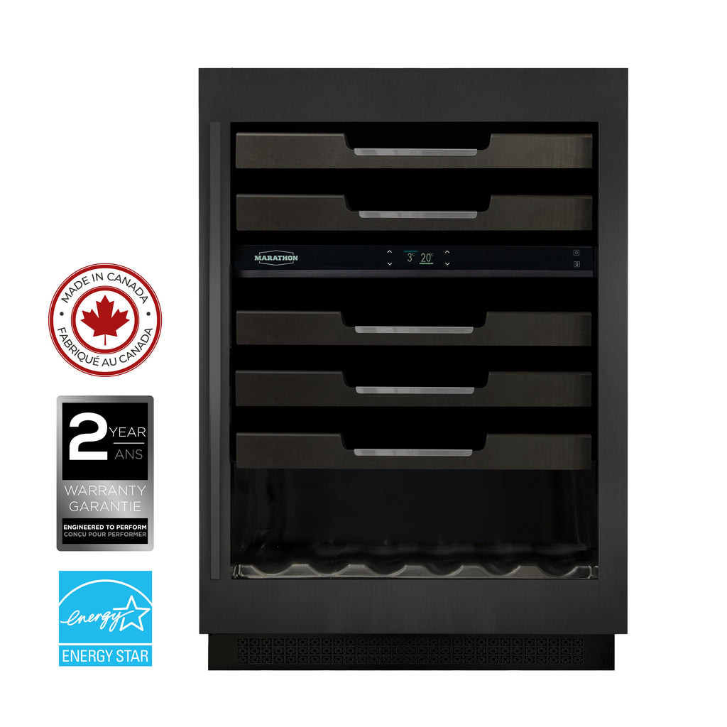 The True North Collection is a celebration of Canadian heritage, inspired by the natural beauty and strength of our landscape. Inspired by the renowned wine region of Brome-Missisquoi in Québec, this Canadian-made dual zone wine cooler brings elegance and precision to wine preservation. With a 52-bottle capacity, it features five handcrafted shelves made from dark-stained Canadian maple, each accented with subtle stainless steel detailing for a refined touch. Dual temperature zones ensure optimal conditions for both red and white wines, while its design reflects the artistry and heritage of Canadian craftsmanship