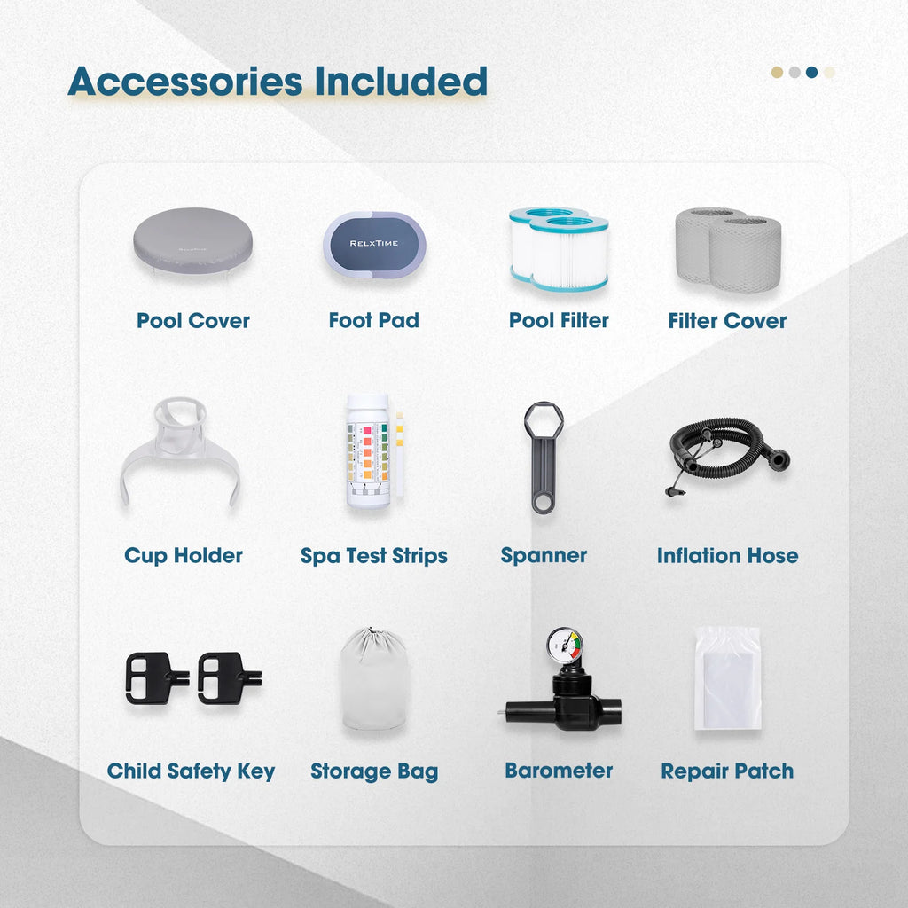- 🌊FULL SET OF ACCESSORIES: 2 filter cartridges & 2 covers, 20 strips water testing, 2 PVC patches, 1 spanner, 1 inflation hose, 1 barometer, 1 air valve cap, 1 way valve, 1 drainage adapter, 2 child safety key, 1 power cable, 1 storage bag, 1 instruction manual.