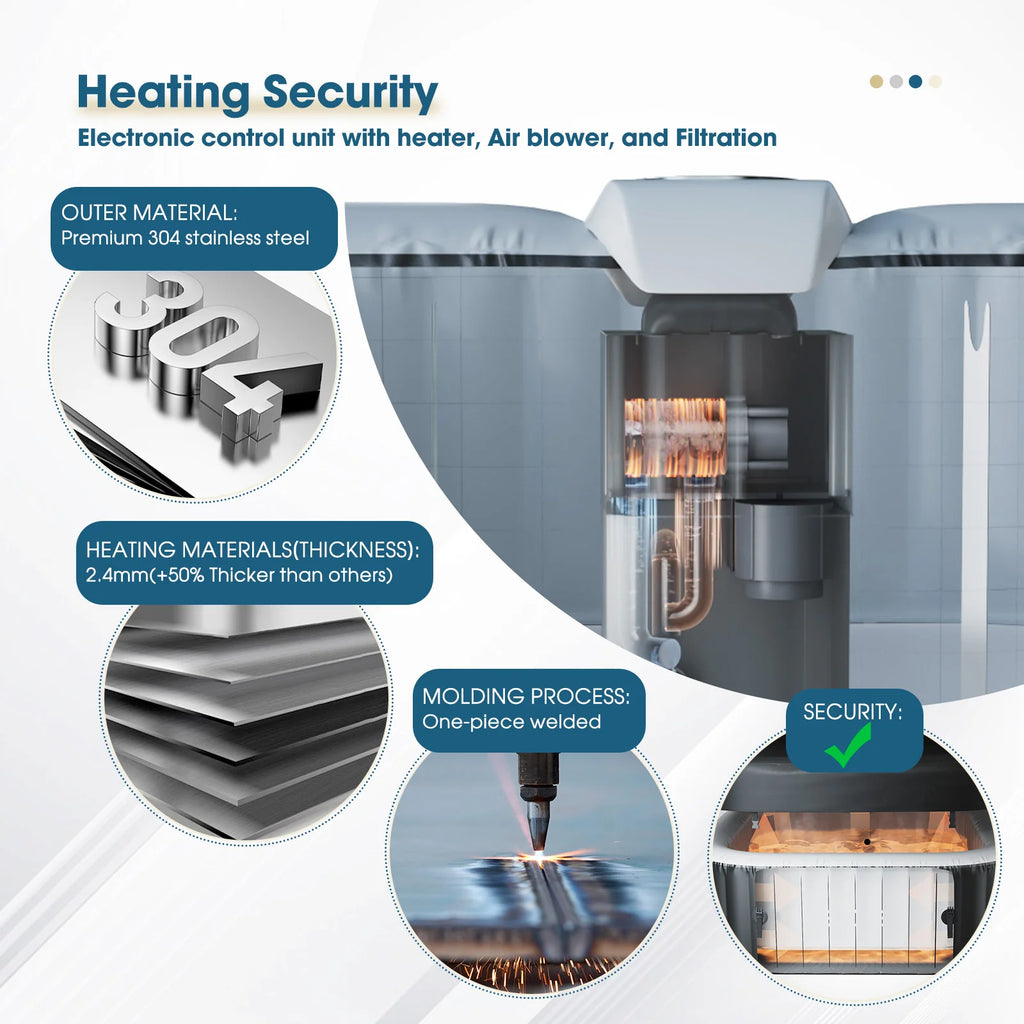 - 🌊ENJOY YOUR PORTABLE SPA YEAR-ROUND: Freeze protection automatic heating function prevents inner components from freezing, you can use your inflatable spa in colder temperatures (above 39.2°F) during the fall or winter seasons to ensure long-lasting use. Do not install or leave the spa outside at a temperature lower than 39.2°F (4°C) and higher than 104℉ (40℃).