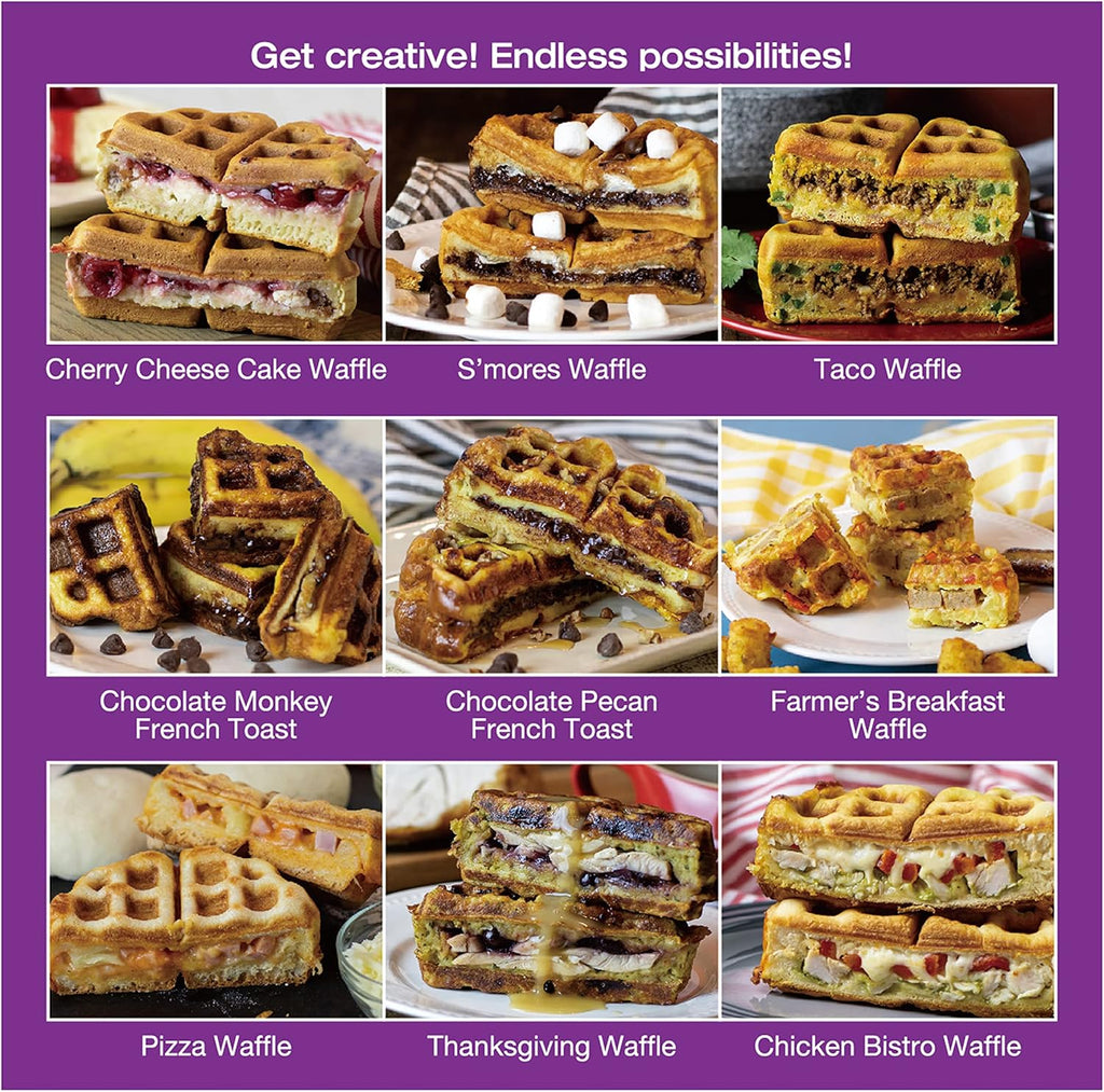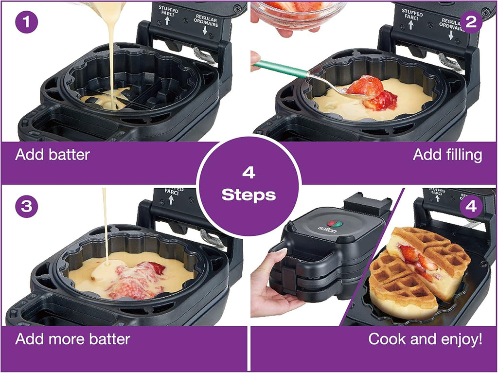 Welcome to waffles reimagined with the Salton STUFFED Waffle Maker. Create delicious, sweet or savory thick Belgian waffles with your favorite toppings stuffed inside. In four easy steps, you can achieve your own appetizing flavor combinations! Just add batter to the non-stick waffle iron, add toppings and more batter on top; cook and enjoy! The Salton STUFFED Waffle Maker makes a 2” deep stuffed waffle. Alternatively, you can easily remove the waffle ring for regular 1” deep Belgian waffles. Transform your waffle experience with endless possibilities for batters and toppings alike! Create waffle meals for breakfast, lunch, or dinner.