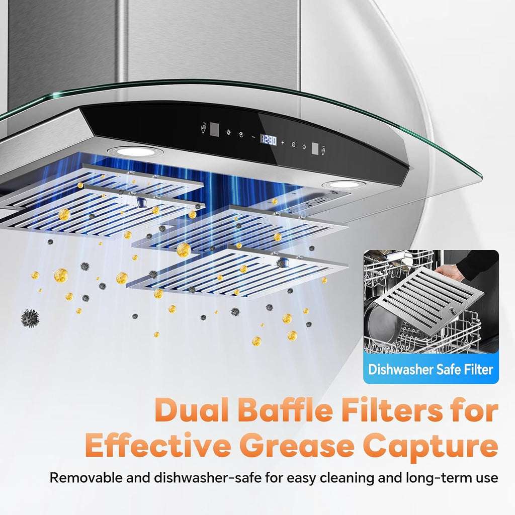 - 【Touch Control Display+ Dishwasher Safe Filters】: Vent Hood features a easy clean and sleek buttonless touch sensitive control panel, just lightly touch with your finger and the display will light up, The professional vent hoods 30 inch has two baffle filters to protect your hood by trapping particles of grease, simply drop in the dishwasher for easy maintenance and cost savings, ensuring a perfect airflow and efficient ventilation of the entire kitchen.