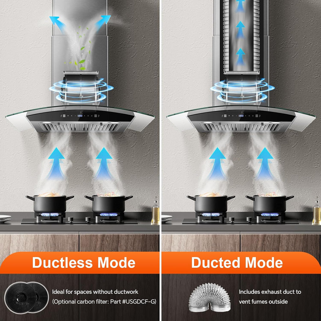 - 【 Dual Ventliation Mode+Adjustale Chimney】: Tieasy range hood can be as ductd or ductless, ducted range hood exhaust air to the outside. Ductless range hood specifically designed for room no extractor duct. Optional Carbon Filter Kit available for ductless (Purchase Part # CF-G). This kitchen vent hood comes with adjustable chimney cover, perfect for 7.5-ft ceiling or 8.5-ft ceiling.