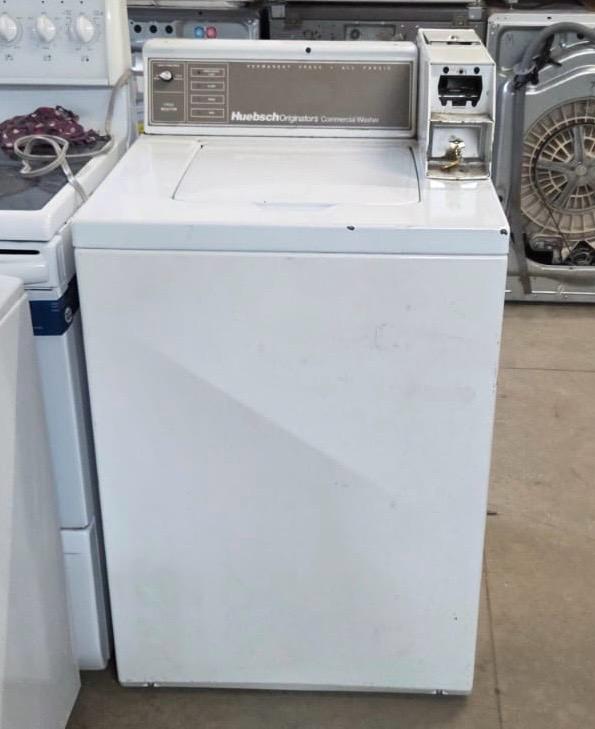 Commercial Huebsch white coin operated top load washer.