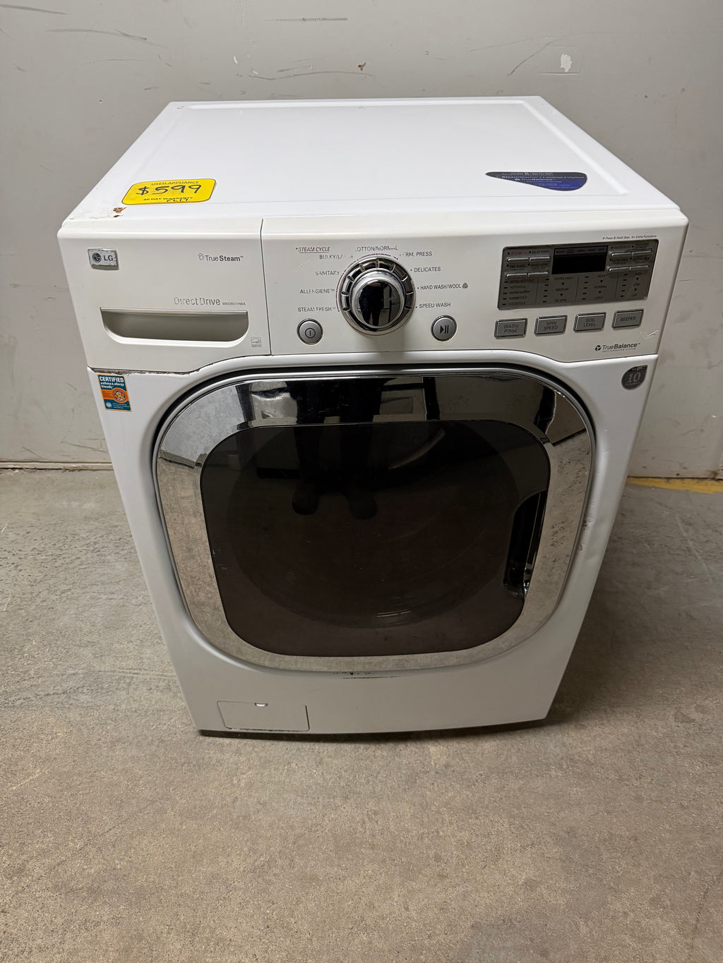 Used white LG front load washer with an impeller wash system