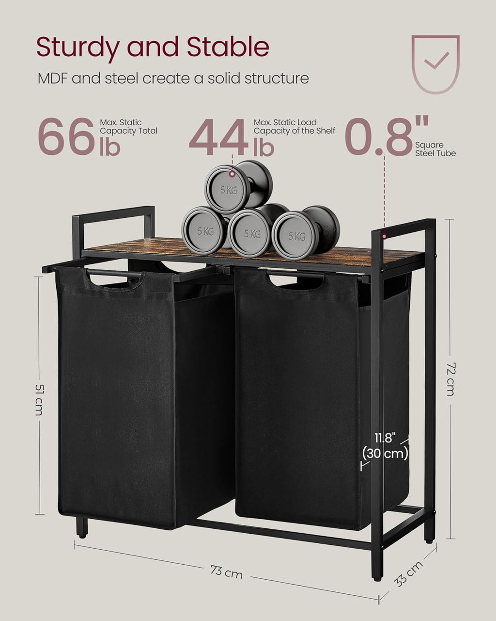 - [Robust & Stable] This laundry sorter features a sturdy 0.8" steel tube frame and MDF panel, supporting up to 44 lb on its top shelf. Moreover, each liner is crafted from water-repellent Oxford fabric, while the four adjustable feet provide added stability
